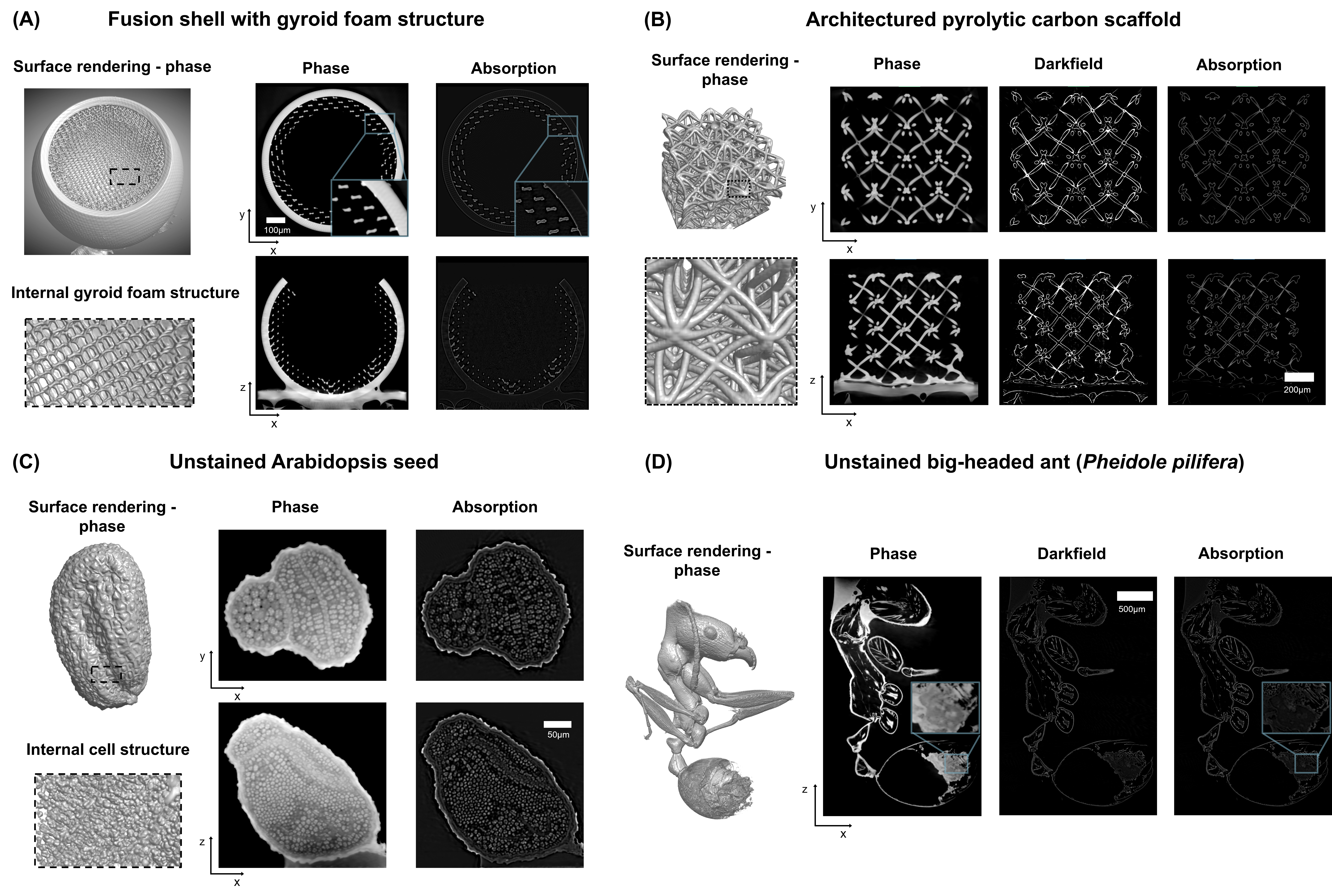 We demonstrate tomographic phase, darkfield, and absorption reconstructions of various small samples. Figure (A) shows a spherical shell with an internal gyroid foam structure, designed for inertial confinement fusion and fabricated using Nanoscribe’s Quantum X system with Two-Photon Grayscale Lithography. The phase reconstruction provides more accurate representation of the foam and shell than absorption imaging. In (B), we show a 3D-printed scaffold for musculoskeletal tissue engineering, manufactured using a pyrolytic process that enables electrical signal conduction to muscle cells. The dark-field image highlights scattering in the carbon material, especially at joint regions.