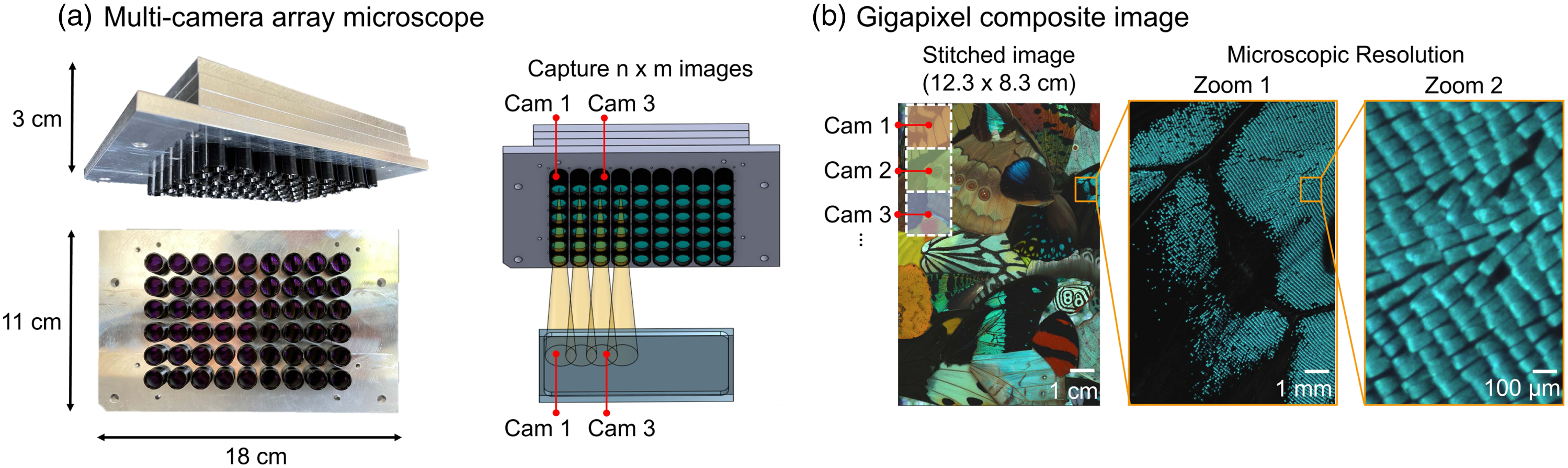 The information content that any optical imaging system can acquire is limited by the spatial bandwidth product. As a result, classical optical imaging systems are typically limited to either high resolution or a large field of view. In this project, we explore using a densely packed array of “micro-cameras” to jointly image a large field of view (FOV) simultaneously at high resolution. Each micro-camera within the array images a unique area of the sample; data acquired by the 54 micro-cameras are then digitally combined into composite frames. The total pixel count of these frames significantly exceeds that of standard microscope systems.
