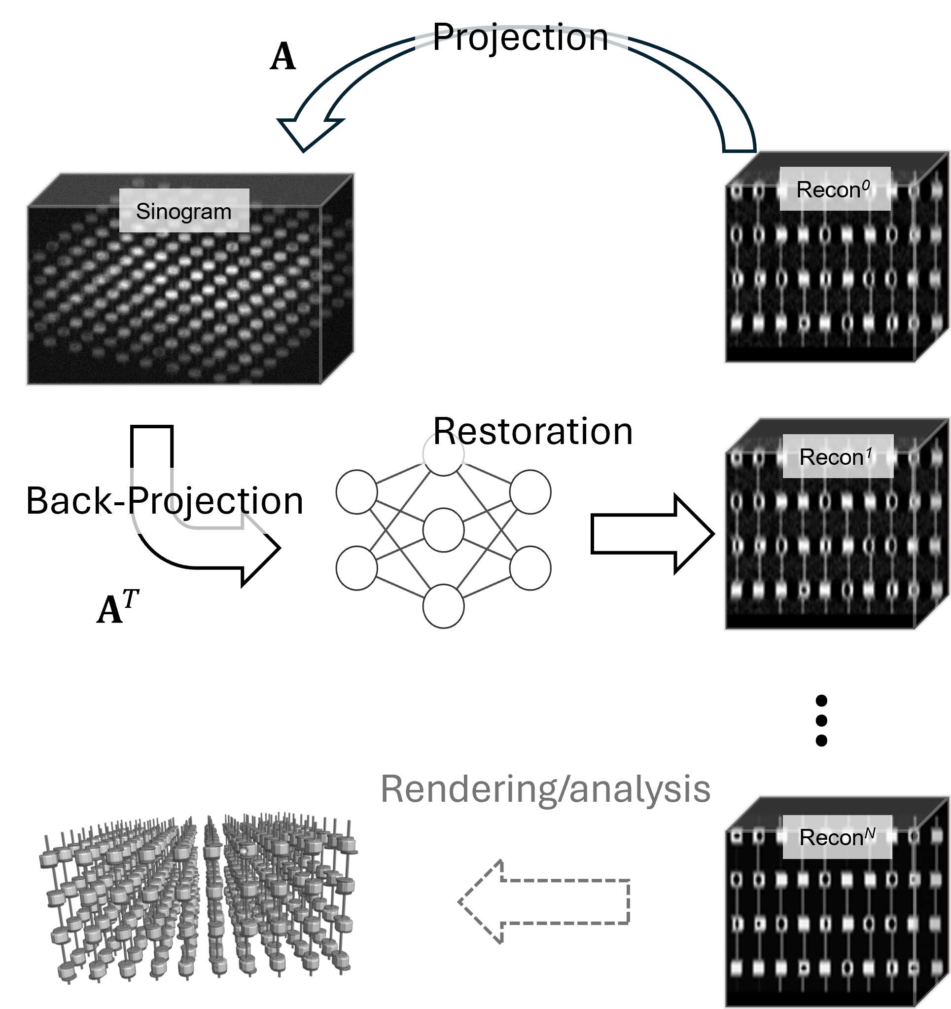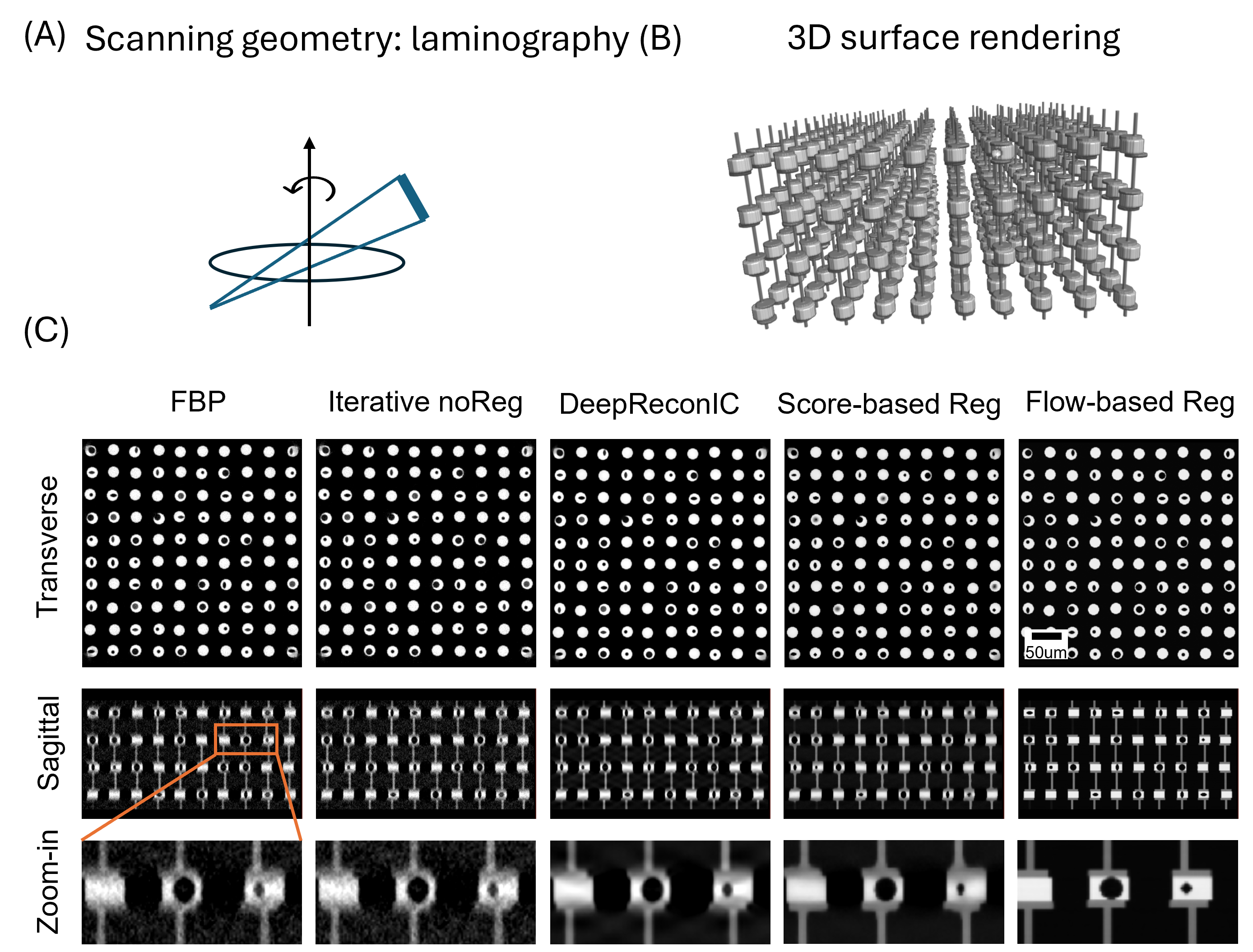 Another popular geometry typically used for large, flat samples is rotational laminography. To scan a plate-like sample, such as a wafer or a printed circuit board, it is often advantageous to use a rotational laminography trajectory for improved throughput and reduced beam-hardening. However, reconstruction from such a trajectory suffers from smearing cone-beam artifacts, as well as vignetting or a truncated field of view (FOV). From the results in the figure below, we see these artifacts in the FBP reconstruction. DeepReconIC is able to remove noise but is unable to mitigate cone-beam artifacts. Both score-based and flow-based reconstruction reduce both noise and artifacts while recovering the structures, while the flow-based method clearly outperforms the others.