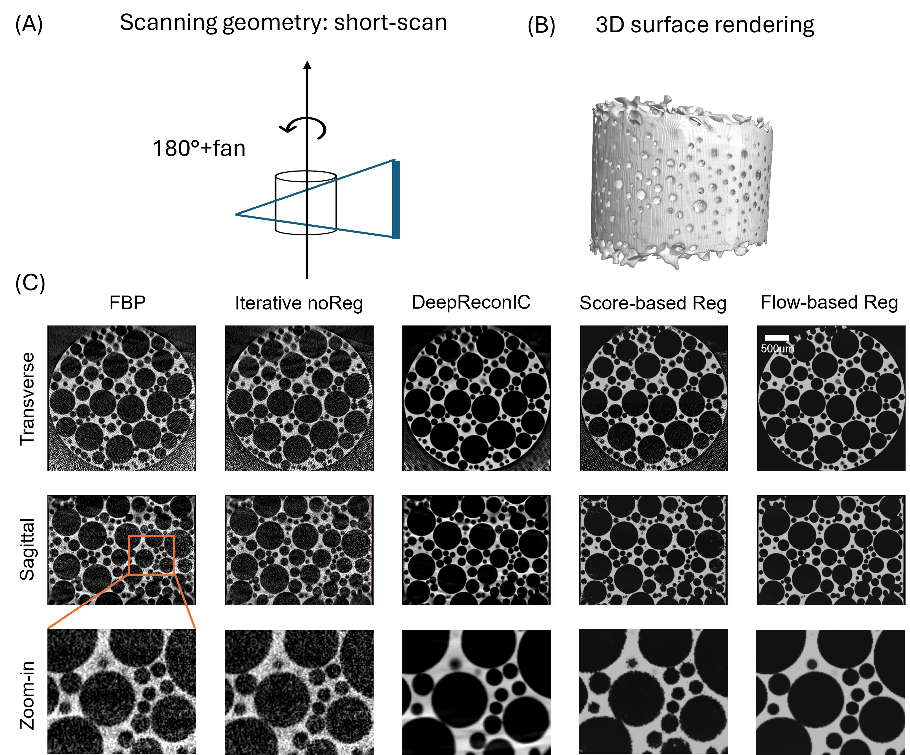 Short-scan, also known as 180+ fan scan, is a widely used circular scanning trajectory for asymmetric samples. In industry CT settings, this is useful for anisotropic samples that either need to be placed close to the source for higher geometric magnification (GeoMag), or to avoid high attenuation along certain directions. However, for CBCT, especially in the high cone angle regions, short scan can result in streak artifacts. Figure below shows reconstruction of a foam-structure sample using various method. From both filted backprojection (FBP) and unregularized iterative reconstruction, we see We see expected streaking artifacts at boundary, and elongated cone beam artifacts, as well as noise. The noise2noise-based DeepReconIC method removes both noise and most steaking artifacts, but was not able to recover smeared and distorted features. Both score-based and flow-based reconstruction are able to surpress noise, while flow-based method shows superior results in artifact removal and feature recovery.